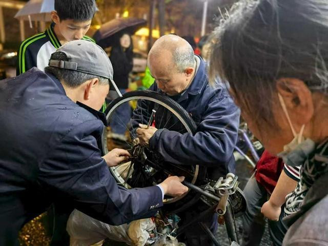 在义务修车点位前,推着故障自行车前来求助的市民络绎不绝。孔胜东熟练操持着扳手、螺丝刀等维修工具,对车辆故障逐一排查、精细调试,小到拧紧螺丝、修补车胎、调试刹车,大到整车零配件更换,每一个操作环节都一丝不苟、精益求精。身旁的青年骨干们同步配合,协助接待市民、传递维修工具、对接服务需求,同时向市民讲解自行车日常养护技巧、雨天安全骑行注意事项,在实操中传承孔胜东数十年如一日的奉献精神,用贴心、细心、耐心的服务回应市民诉求。